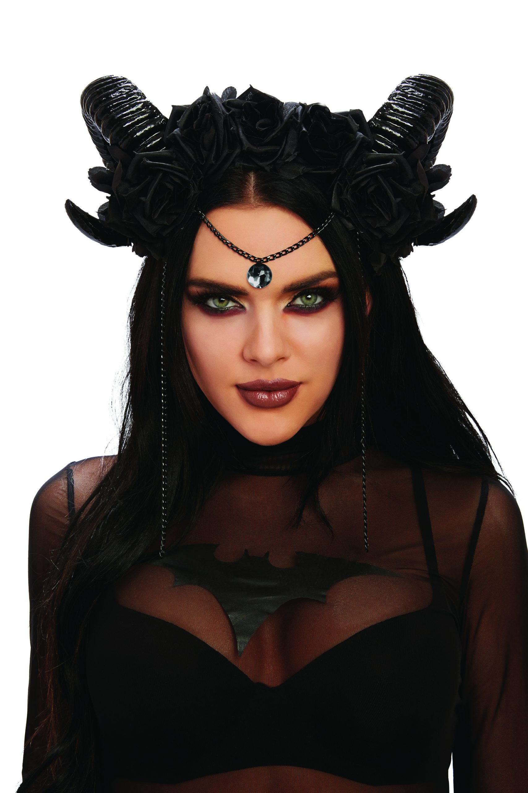 Mystical black ram's horn headpiece with black roses, rhinestones, and chain detailing. One Size fits most, one-piece set.